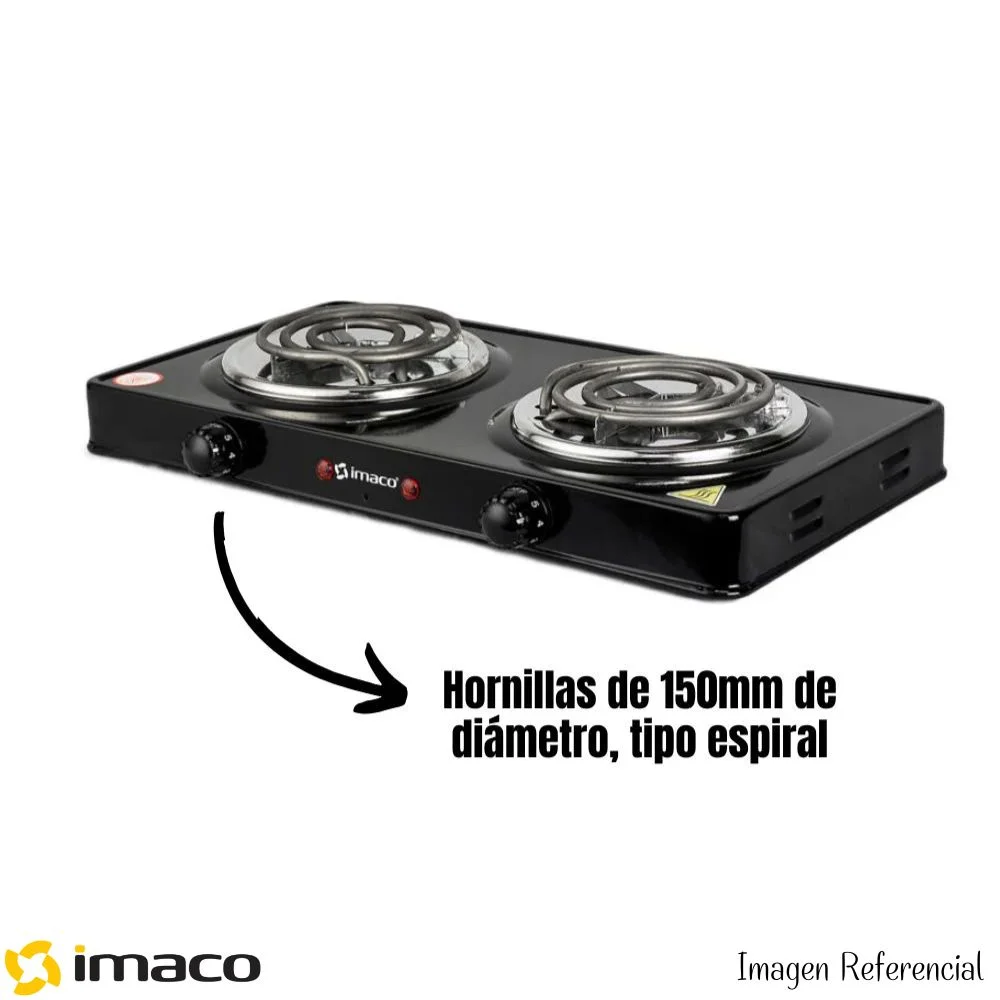 Cocina Eléctrica 2 Hornillas Imaco HP1400 podrás cocinar de forma rápida y segura cualquier tipo de receta, además por su tamaño compacto se puede instalar fácilmente en cualquier tipo de mesa o un buen soporte estable, se pude usar cualquier tipo de ollas, sartenes, cacerolas, teteras o incluso ollas de presión, su cuerpo de metal le da mayor duración y estabilidad, sus hornillas son de 150 mm de diámetro tipo espiral, cuenta con 2 perillas independientes para controlar la temperatura a cada hornilla, dos luces indicadoras de encendido y listo, termostato que mantiene el calor deseado para ahorrar energía.