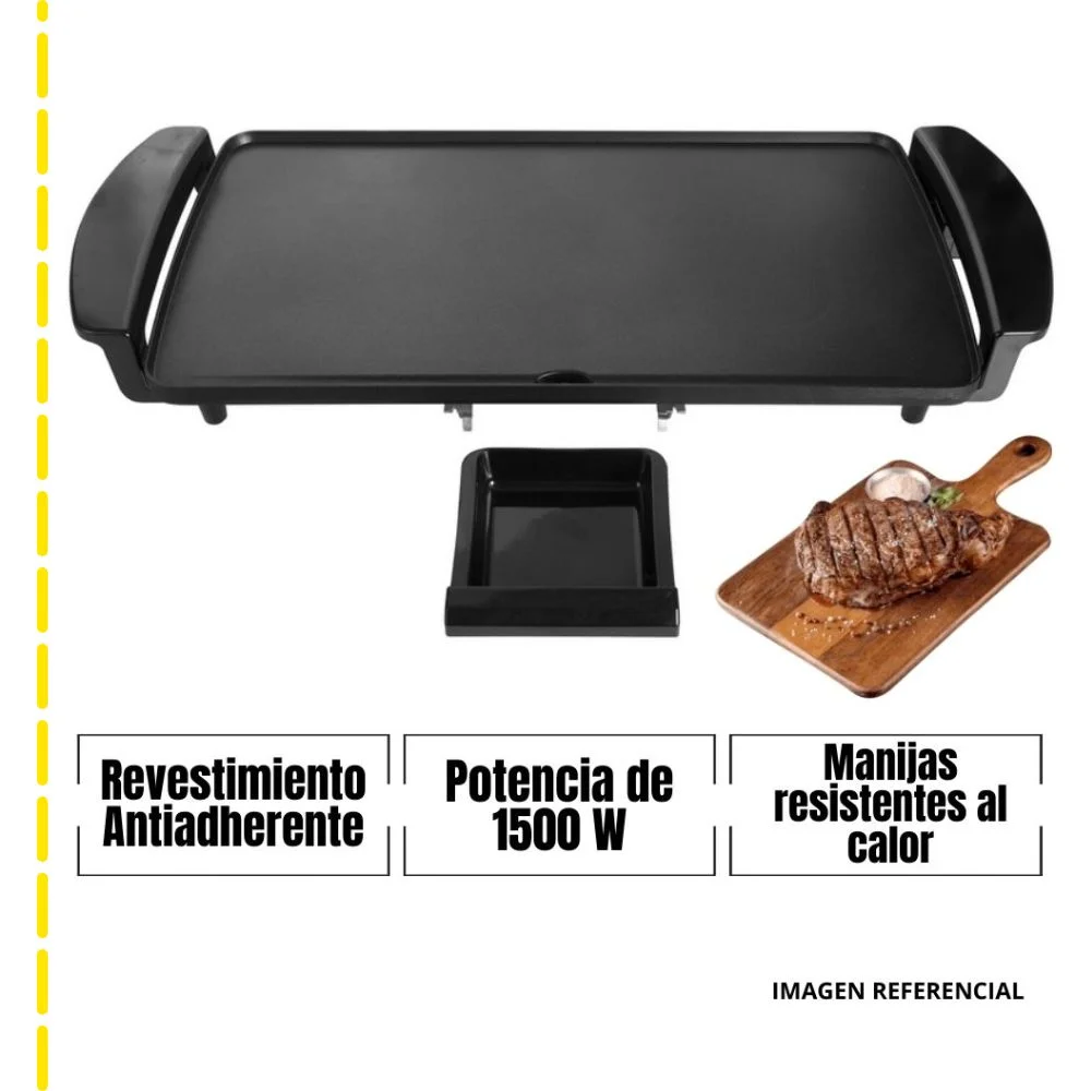 Prepara tus comidas favoritas con facilidad y rapidez. Su superficie antiadherente de alta calidad garantiza una cocción uniforme y sin complicaciones, mientras que sus 1500W de potencia ofrecen un rendimiento excepcional. Perfecta para asar, tostar y cocinar todo tipo de alimentos.