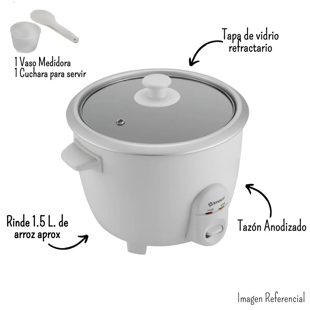 Prepara un delicioso y fresco arroz con la Imaco RC15N que exhibe un tazón de aluminio anodizado de 1.5L con tapa de vidrio refractario que permite visualizar la cocción. Esta olla de 500W de potencia tiene la función Warm para mantener caliente el arroz después de cocinado.