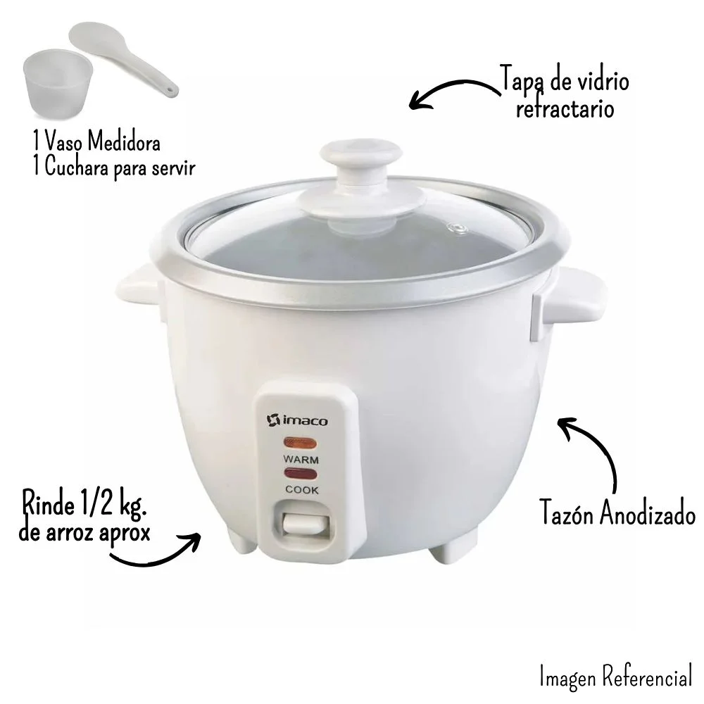 La Olla Arrocera RC006 de Imaco es perfecta para ahorrar tiempo y trabajo. Este producto puede tener múltiples usos. Asimismo, tiene un sistema de apagado automático, el tazón es de Aluminio anodizado con capacidad para 0.6 litros y tapa de vidrio templado.