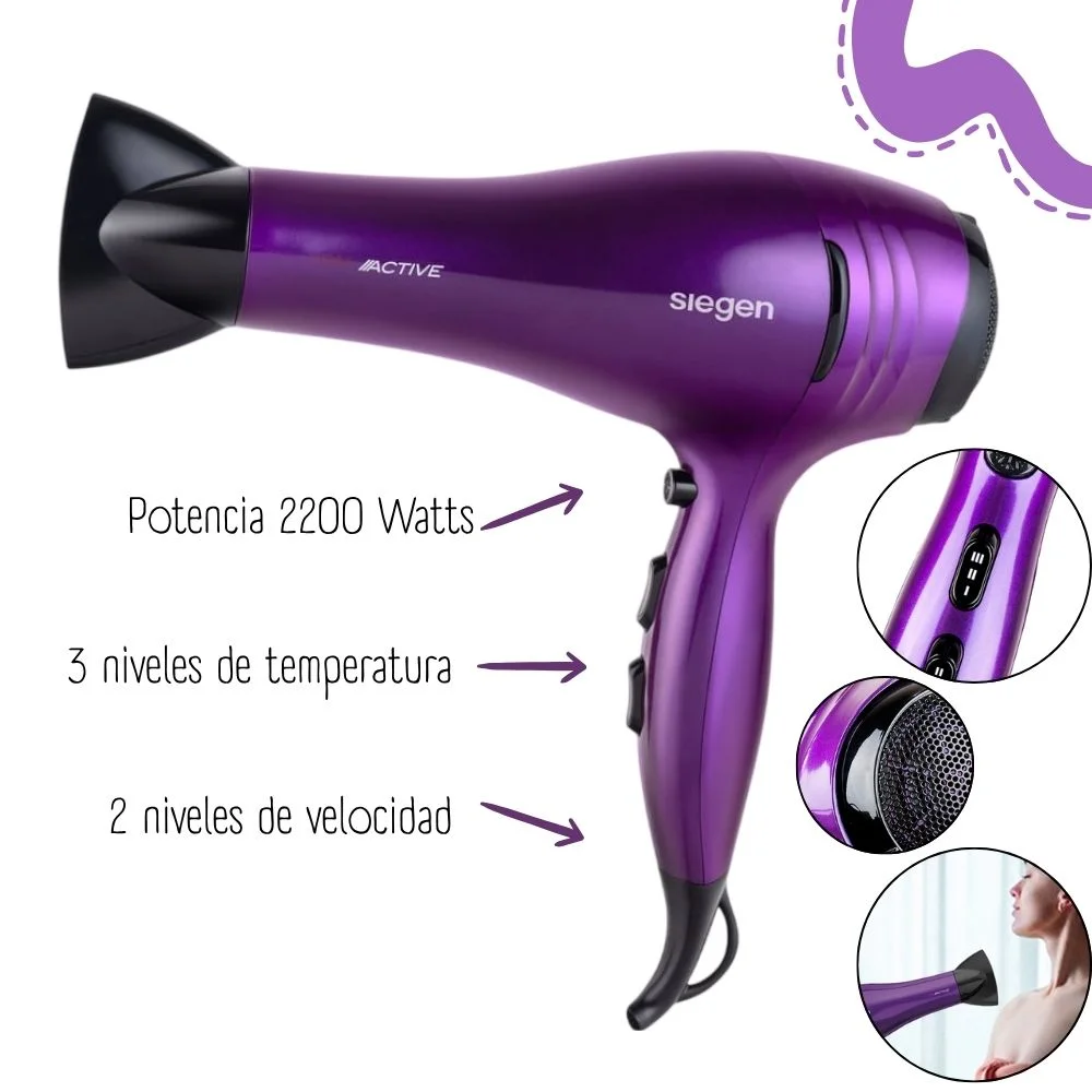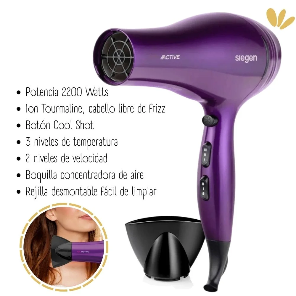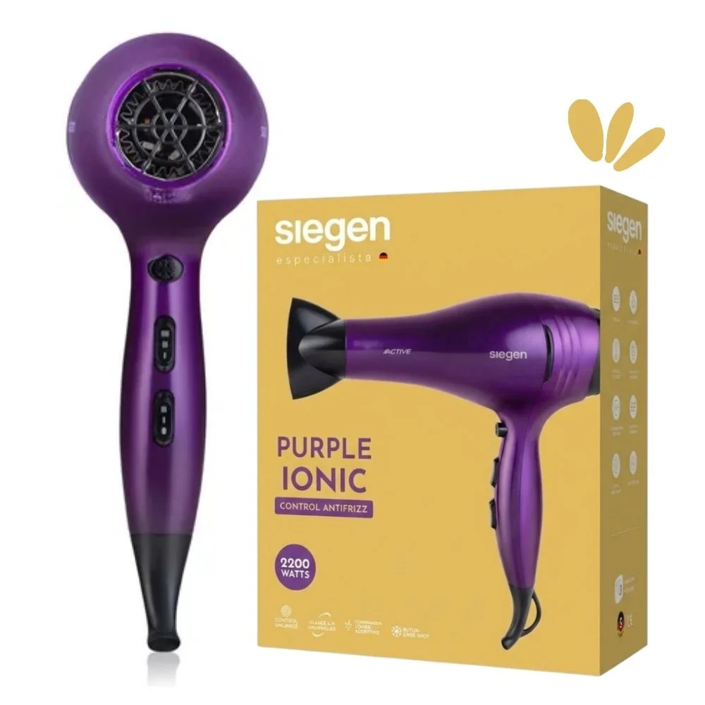 Secadora de cabello SIEGEN para uso personal. Cuenta con motor DC, potencia de 2200 watts. Tiene propiedades de iones negativos, 3 niveles de temperatura y 2 velocidades. Además, la rejilla es desmontable para una fácil limpieza.